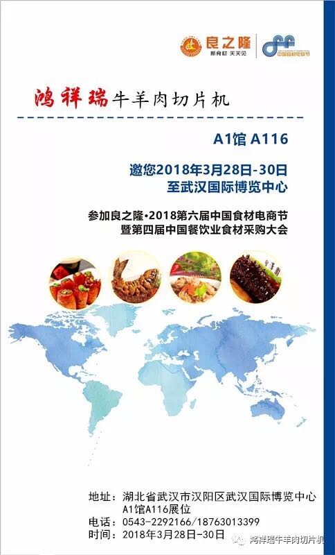 鴻祥瑞牛羊肉切片機廠家誠邀您于2018年3月28日參加良之隆-2018第六屆中國食材電商節(jié)暨第四屆中國餐飲業(yè)食材采購大會!
